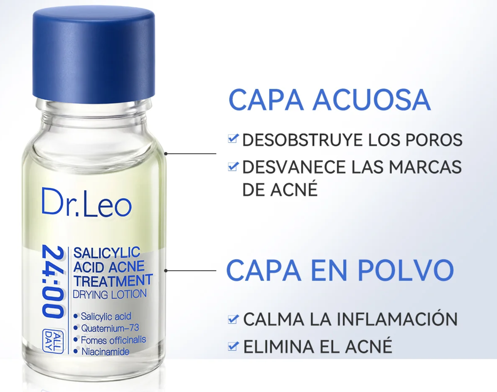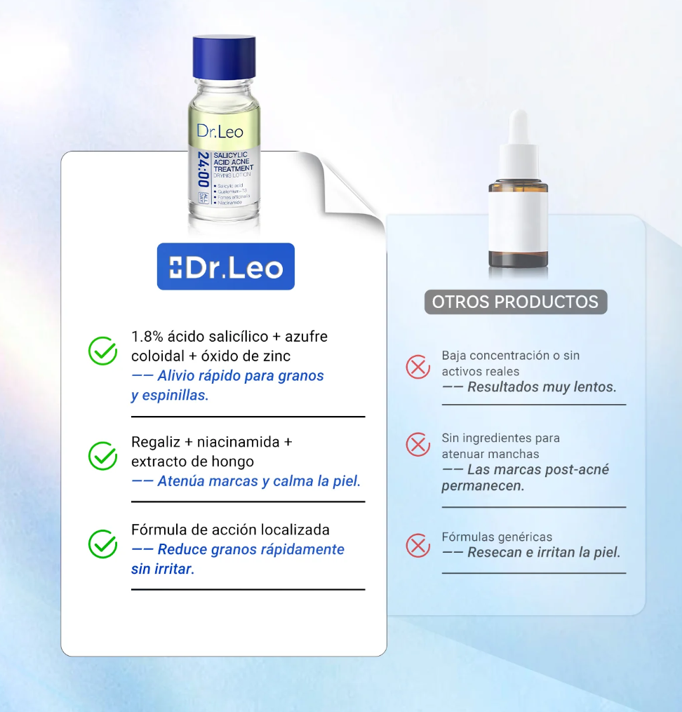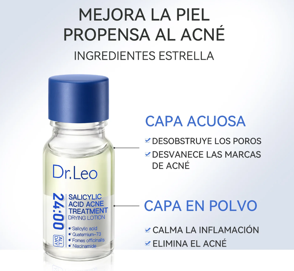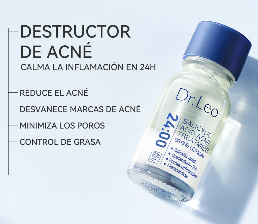 La loción secante para el acné con ácido salicílico DR. LEO, desarrollada por dermatólogos estadounidenses, actúa eficazmente sobre los comedones cerrados, el acné rojo inflamado y los brotes repentinos.
